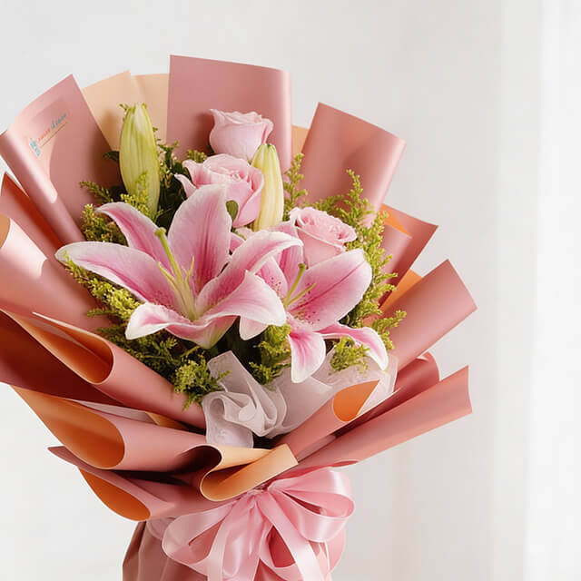 Introducing Lily Serenade, an elegant floral arrangement exuding sophistication and beauty. With lilies symbolizing purity, three delicate pink roses adding a romantic touch, and solidago for golden vibrancy, this arrangement is perfect for occasions like Valentine's Day, Mother's Day, anniversaries, birthdays, congratulations, or Women's Day. Lily Serenade brings radiant elegance to any space.