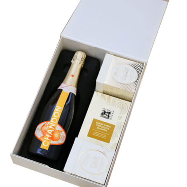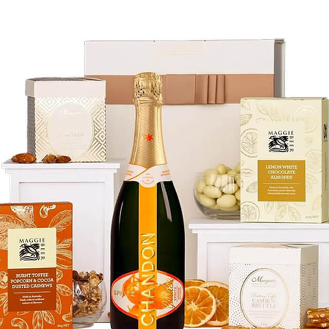 Inside The Hamper: - Morgan's French Vanilla Almonds 175g - Morgan's Cashew Toffee Brittle 135g - Maggie Beer Burnt Toffee Popcorn & Cocoa Dusted Cashews - Maggie Beer Lemon White Chocolate Almonds 140g - Chandon Garden Spritz 750ml