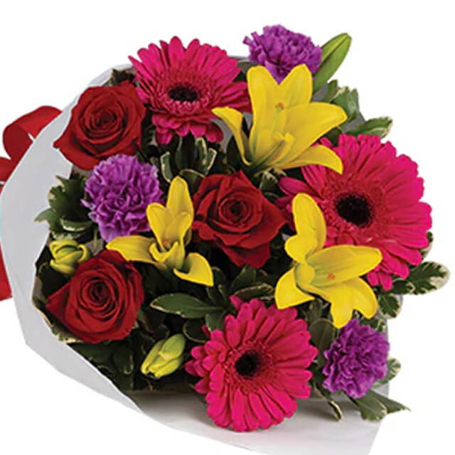 Let the sun shine in with this exuberant bouquet of golden lilies, rich red roses and hot pink gerberas.