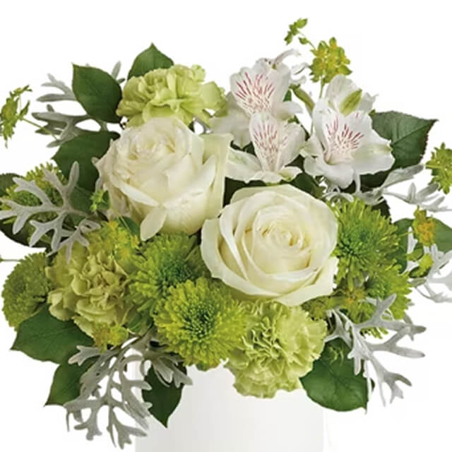 Like an invigorating ocean breeze, this fresh arrangement of white roses and glorious green blooms is a beautiful pick-me-up on any occasion. The lucky recipient will adore this stunning pot arrangement.