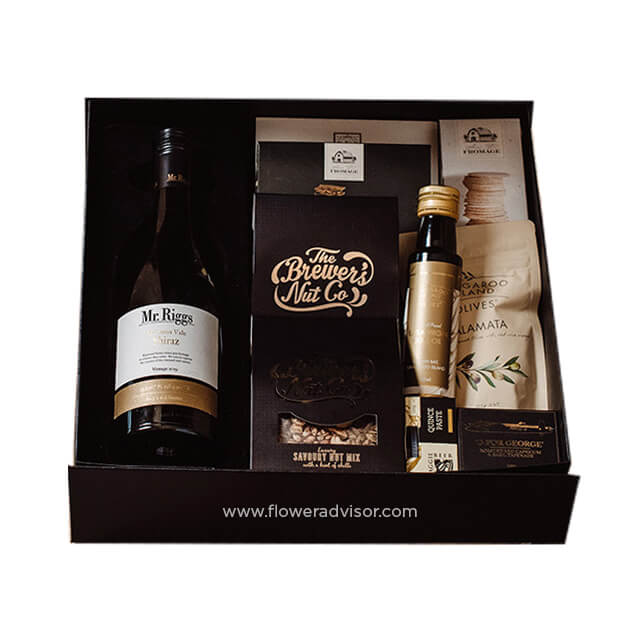 Featuring The Delicious Mr Riggs McLaren Vale Shiraz Includes: - Brewer's Nut Co. Classic Beer Nuts 120g - L’Orto Di Franco Semi-Dried Tomato Halves 125g - Kangaroo Island Olives Kalamata Olives 185g - Brewer's Nut Co. Savoury Nut Mix 120g - Regimental Condiment Co. Roasted Capsicum Tapenade 85g - Avec du Fromage Natural Wafers 100g - Avec du Fromage Artisan Crackers 100g - Maggie Beer Quince Paste 100g - Mr Riggs McLaren Vale Shiraz - Kangaroo Island Extra Virgin Olive Oil 100ml