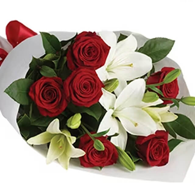 Add some romance with this rich bouquet of luxurious red roses and white lilies.