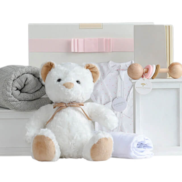 The arrival of a daughter is such a joyous occasion, and this luxury baby girl hamper will make the memories even cuter. Opening this hamper, the proud parents will find our favourite plushie, a Whistlewood Plush Bear, for her little arms to squeeze. Also included is a silicone/beechwood baby rattle in pink, a bamboo muslin wrap, a Sheridan blanket, and a pink growsuit.