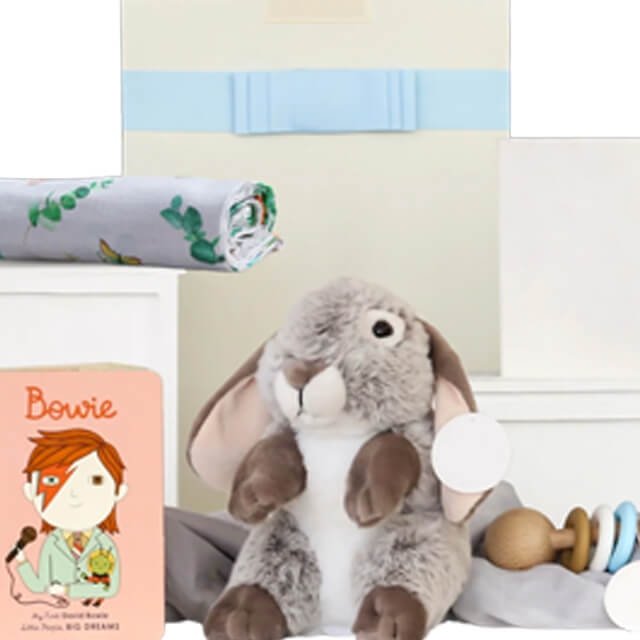 Help a little baby boy dream big with a storytime session themed around the beloved David Bowie with this baby hamper. It features an inspirational story about Bowie's life's work, Buttons the Bunny for cuddles, a bamboo muslin wrap for baby, and a Beechwood Rattle for teething. It's a gift box with good memories inside.