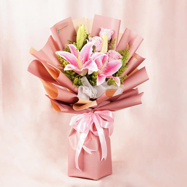 Introducing Lily Serenade, an elegant floral arrangement exuding sophistication and beauty. With lilies symbolizing purity, three delicate pink roses adding a romantic touch, and solidago for golden vibrancy, this arrangement is perfect for occasions like Valentine's Day, Mother's Day, anniversaries, birthdays, congratulations, or Women's Day. Lily Serenade brings radiant elegance to any space.
