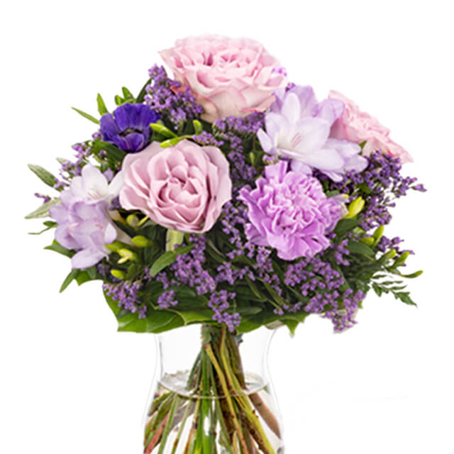 Delightful flower bouquet with 2 lilac freesia, 3 lilac roses "Memory Lane", lilac limonium, 2 lilac carnations, 1 blue anemone and plenty of greens. Diameter about 30cm.