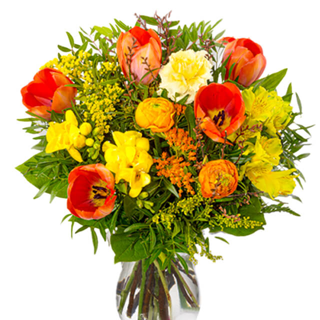 Colorful bouquet with 5 orange tulips, 1 solidago, 2 orange ranunculus, 1 light yellow carnation, 2 yellow freesia, 1 asclepia, 1 yellow alstroemeria, 3 downy birch branches, 3 leather fern, 6 pistochia and 4 salal. Diameter about 30cm.