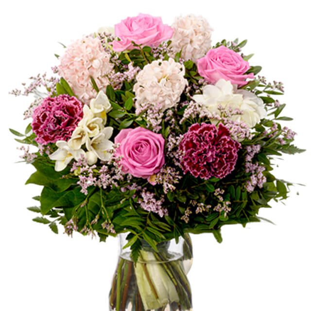 Unique flower bouquet with 3 light pink roses, 3 white freesia, 3 light pink hyacinths, pink limonium, 2 bordeaux coloured carnations "St. Nob. Burgundy" and plenty of greens. Diameter about 25cm.