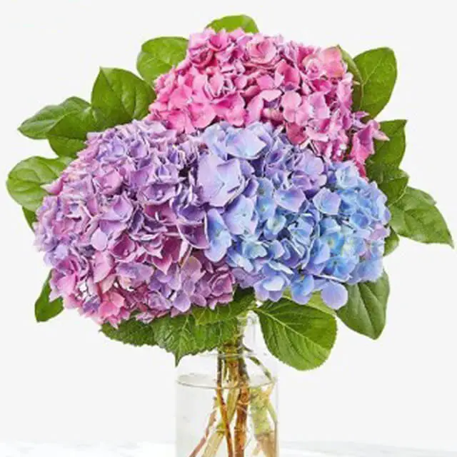 An arrangement of Mixed Color Hydrangeas like Blue, Pink, and Purple in a Vase. Colors of Hydrangea may substitute due to availability