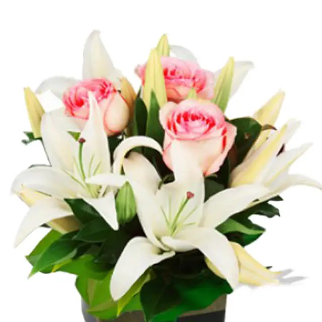 A box vase arrangement of 3 Pink Roses, 4 White Lilies, and other seasonal flowers as fillers.
