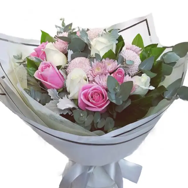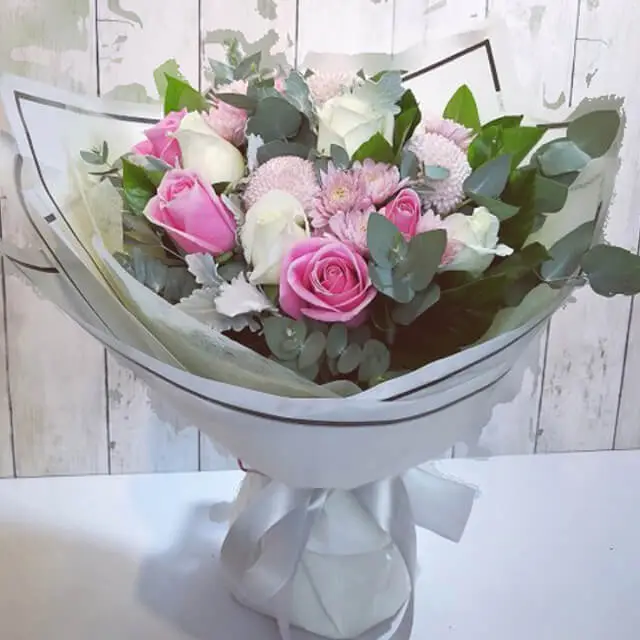 Pink Ping Pong Flowers with Pink roses and white roses beautifully in round bouquet