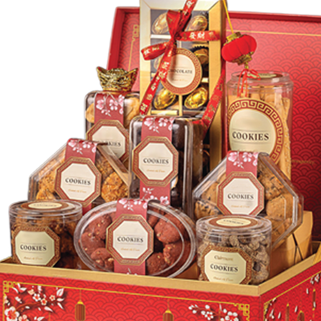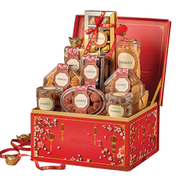 Premium Gold Chocolates: Koleksi cokelat eksklusif berbalut emas dalam kemasan kotak tinggi di puncak hampers.