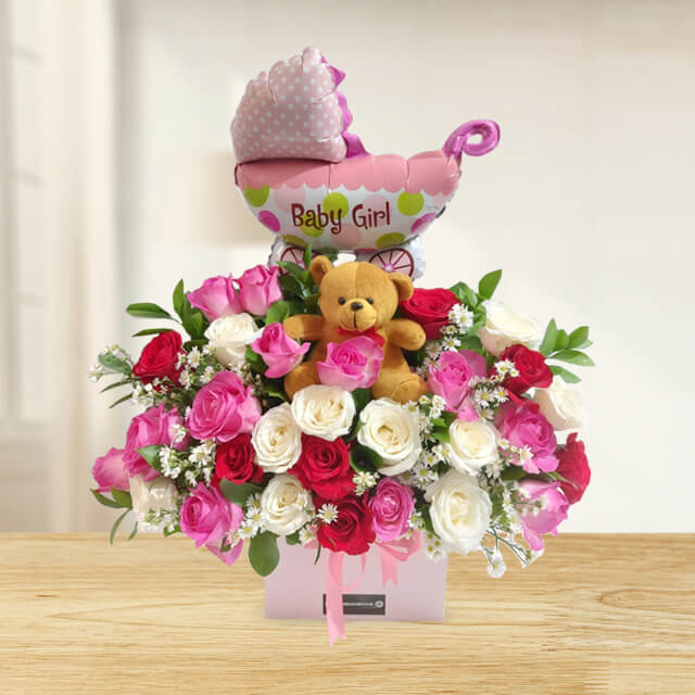 Flower Baby Gift in pink theme, consisting of Red Roses, Pink Roses, White Roses, Balloon, Teddy Bear, and Fillers.