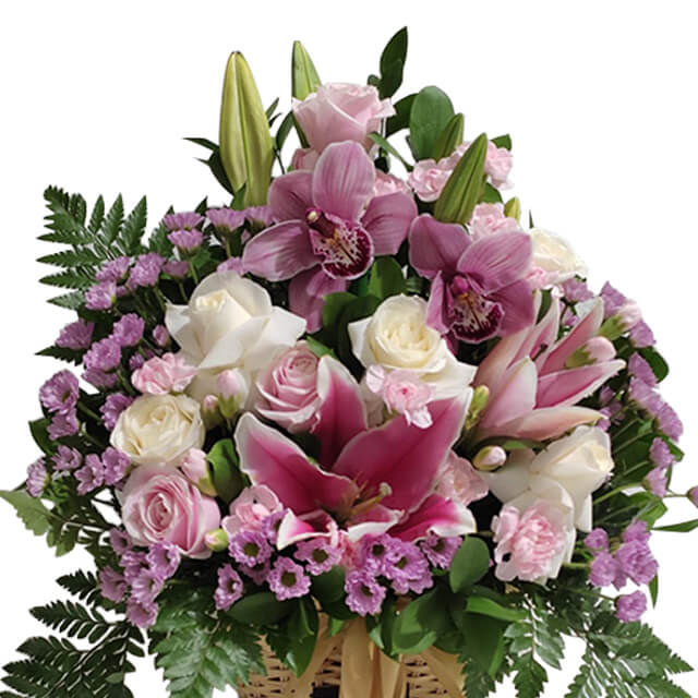 A charming basket arrangement featuring lilies, white roses, cymbidiums, asters, and green fillers. This elegant arrangement is perfect for celebrating a special anniversary, adding a touch of beauty and warmth to the occasion. For a congratulatory gift, it’s an ideal choice to bring joy and convey heartfelt wishes. Suitable for a wide range of celebrations and especially thoughtful for women.