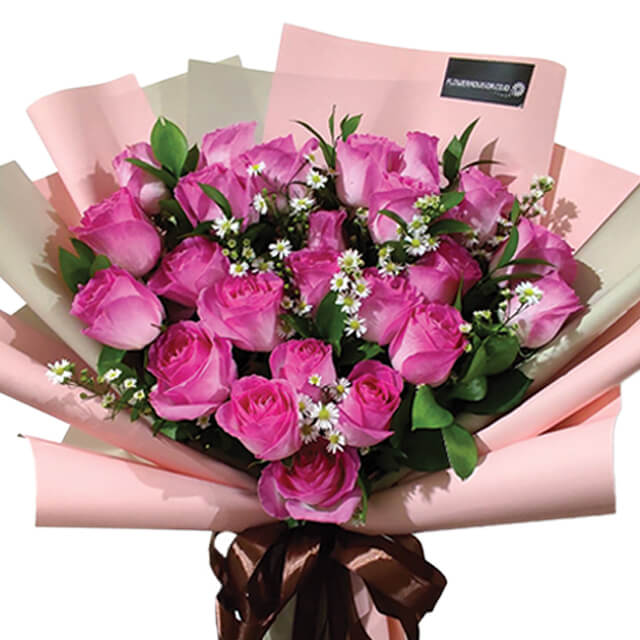 A beautiful hand bouquet featuring 24 pink roses arranged with lovely fillers. Perfect for any occasion, including birthdays, weddings, or as a heartfelt gesture of love.