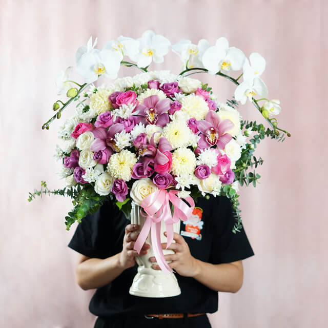 A beautiful table flowers arrangement featuring purple, white, and yellow flowers, including purple roses, orchids, cymbidium, gompies, and white roses with green fillers. Perfect for weddings, Mother's Day, birthdays, congratulations, Teacher's Day, Women's Day, or for your beloved woman.