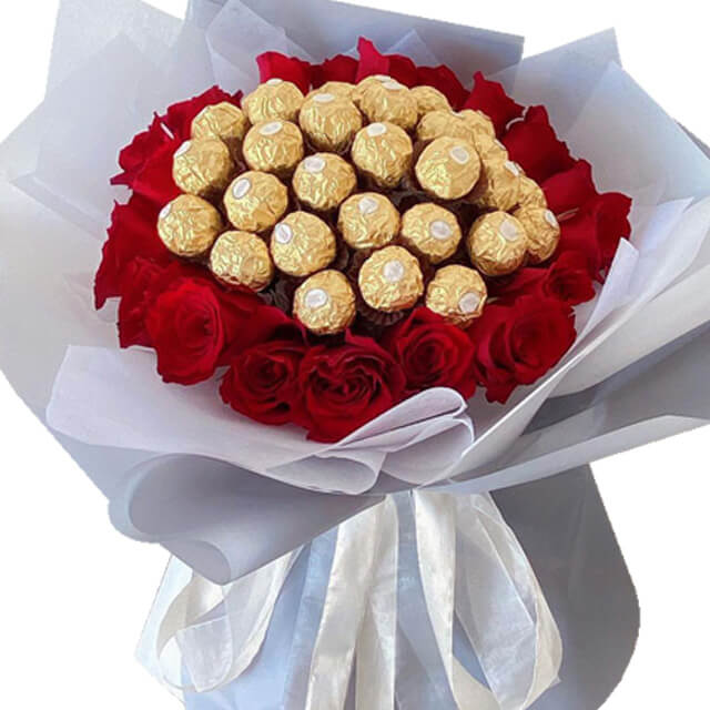 Rayakan momen istimewa dengan The Queen, buket mewah yang memancarkan keanggunan dan kemanisan. Rangkaian menawan ini terdiri dari 24 mawar merah yang mempesona dan 27 cokelat lezat yang disusun indah dalam buket, menambah sentuhan kelezatan yang mewah.