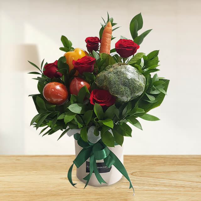 5 Red Roses, Broccoli, 2 Tomatoes, 1 Bell Pepper and Ruscus fillers arranged in a bloom box.