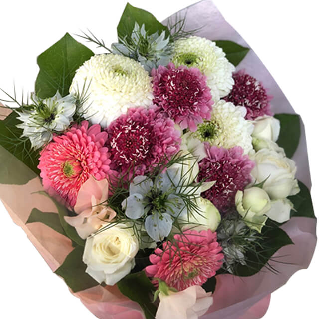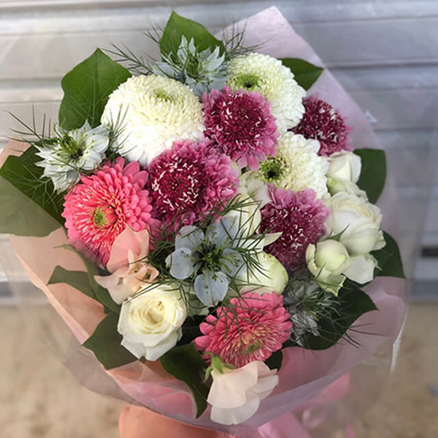 3 x White Gerberas 2 x Pink Gerberas Seasonal Flwoers Green Fillers Wrap Ribbon Card