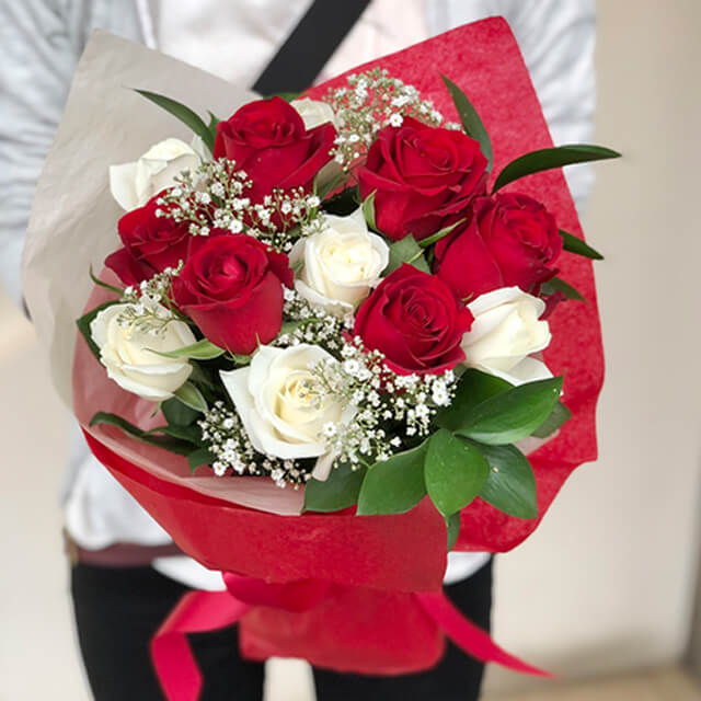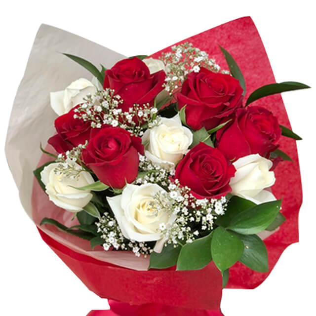 6 x Red Roses 6 x White Roses Filler Flowers Green Fillers Wrap Ribbon Card