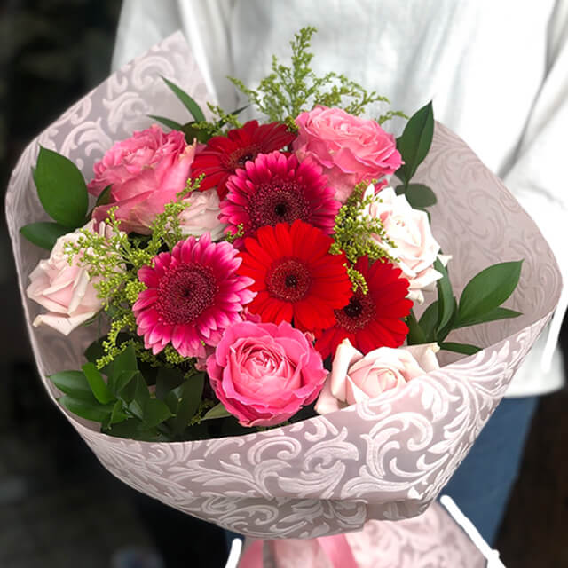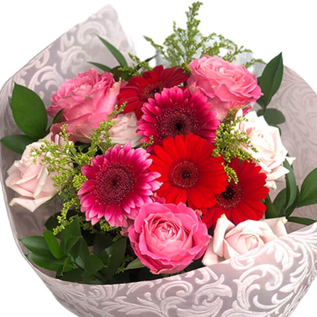 7 x Roses 5 x Gerberas Green Fillers Wrap Ribbon Card