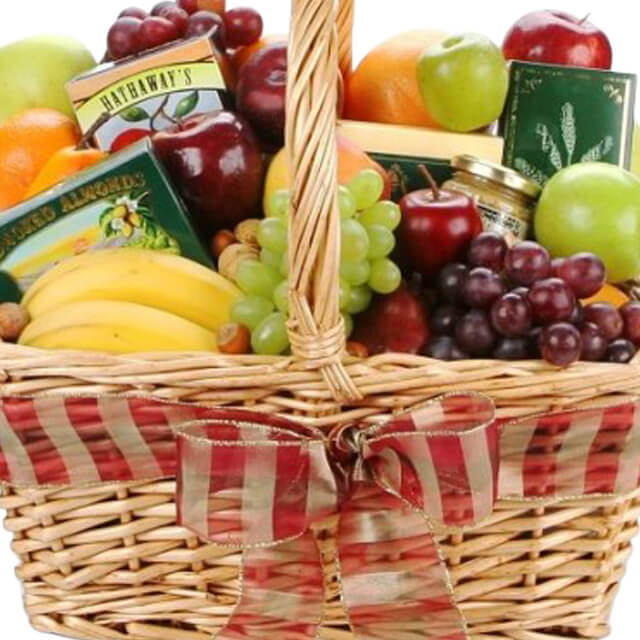 Filled with fresh fruit and gourmet goodies, this classic basket combines the sweet satisfaction of fruit with rich flavors.Recipients will enjoy a basket of fruit that may include apples, oranges, bananas, or grapes. The basket is then accented with gourmet snacks such as sausage, crackers, and cheeses.Each basket is a one-of-a-kind creation by an experienced, local florist. Specific items included in the basket will be chosen based on freshness and local availability.Photo shown is a representation of the final product. Specific container, fruit, and gourmet items shown will change due to florist preference.