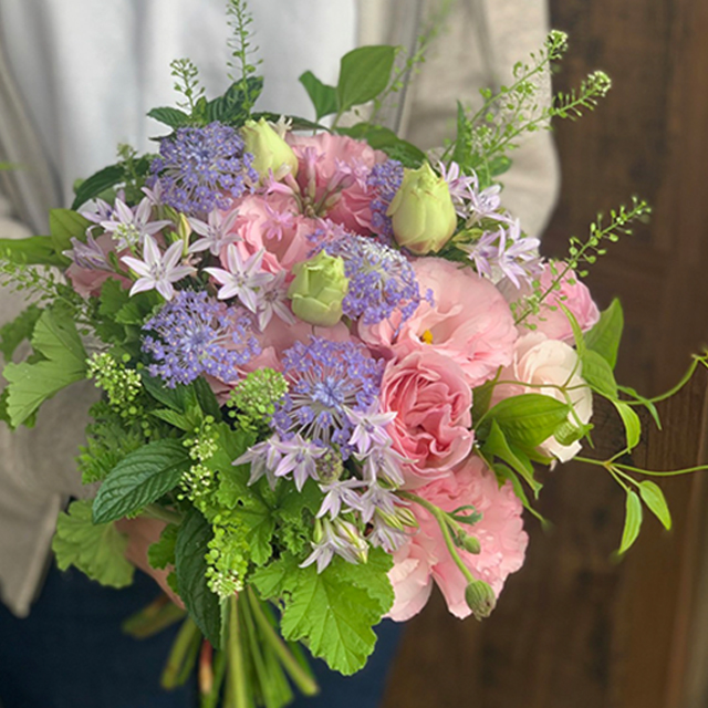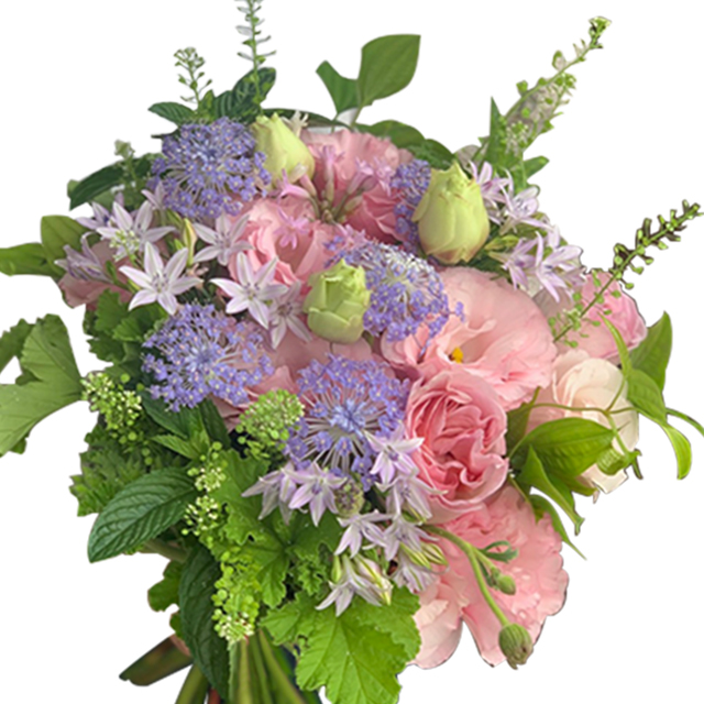 2 x Pink Lisianthus 2 x Pink Roses Seasonal Flowers Green Filler Wrap Ribbon Card