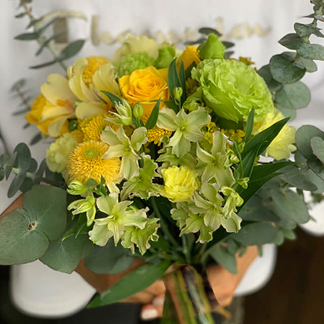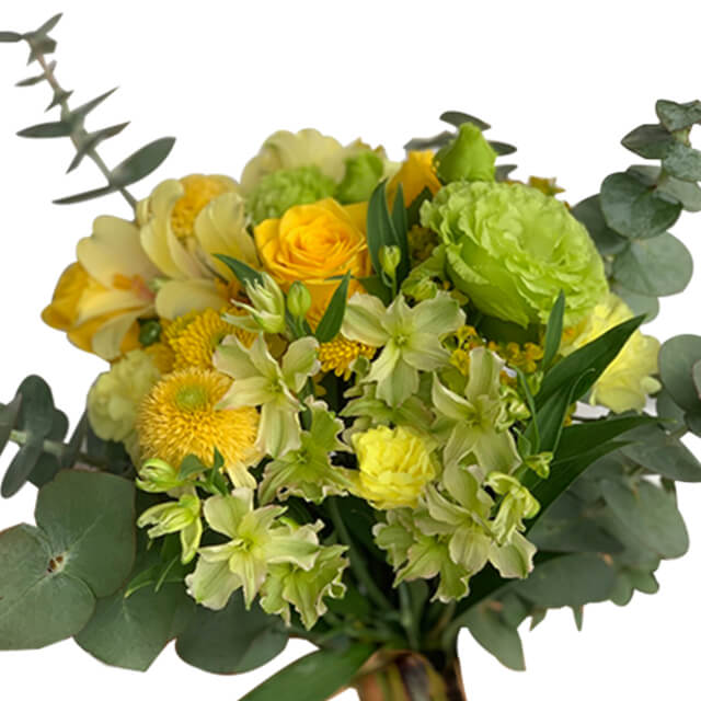 3 x Yellow Roses 1 x Lisianthus (Green) Seasonal Flowers Green Fillers Wrap Ribbon Card