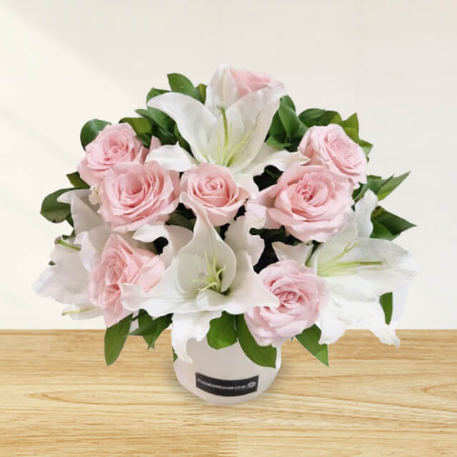 A graceful table flowers arrangement featuring 4 elegant white lilies and 10 sweet pink roses, complemented by fresh green fillers in a stylish vase. This charming blend radiates warmth and elegance, perfect for celebrating life’s special moments or expressing heartfelt sentiments with a touch of timeless beauty.