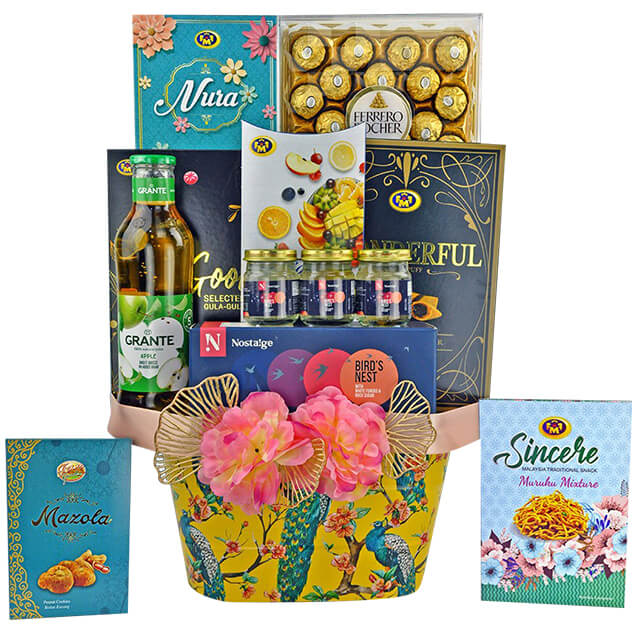 Ferrero Rocher T24 Chocolate Grante 100% Apple Juice 750ml Nostalge Bird\'s Nest with white Fungus & Rock Sugar 3x70ml Mazola Peanut Cookies 60gm Fruitio Dreid Fruit 60gm Nura Nutty & Snack Mixture 60gm Wonderful Cream Puff 70gm Sincere Muruku 70gm Goodiz Selected Candy 70gm Pre-Printed Iron Basket with Ribbon Decoration