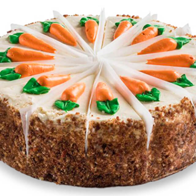 When chocolate isn't your go-to, and a birthday is on the horizon, it can be a challenge to find a cake that works best. Fear not my bunny friends, as we have a cake that is sure to please. This 10-inch round carrot cake is pre-sliced and topped with hand-decorated icing carrots, perfect to finish it off. This cake is made with grated carrots, coconut, raisins, walnuts and spicy cinnamon, making it a delectable treat for any time of the year. Say Happy Birthday, or surprise a special loved one any day of the year with the Delightfully Delicious Carrot Cake (serves 8-10).