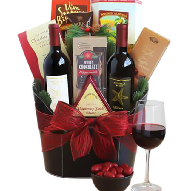 Holiday Wine Gift BasketsThis elegant gift of California red wine and savory snacks is delicious way to make the holidays merry. Toast the holidays and good times with family and friends! the spirits of the Holidays.