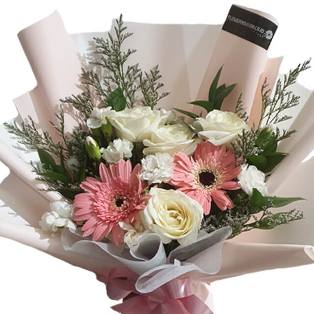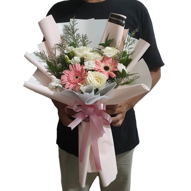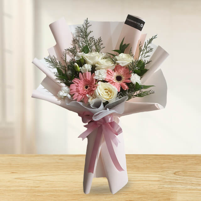 Embrace the beauty of our warm hand bouquet, crafted with love and filled with 2 cheerful gerberas, 4 elegant white roses, soft white carnations, and caspea for a natural touch. Each bloom in this bouquet is carefully arranged to bring a sense of calm and brighten any special moment such as Anniversary, Birthday, Graduation and mother's day.