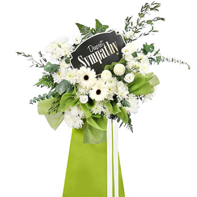 Express your condolences with this classic standing floral arrangement. Each petal and leaf carries your thoughts and heartfelt wishes, offering a tangible expression of sympathy and support.