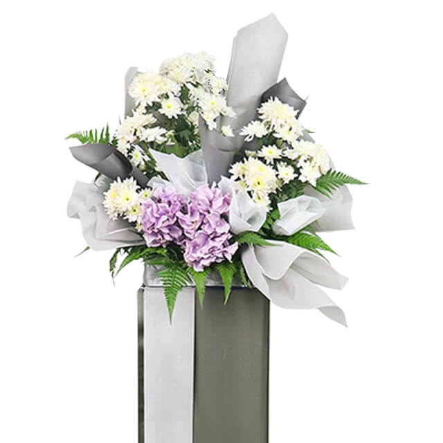 When words fall short, a floral tribute can offer solace and comfort. This serene arrangement is a place of purity, honoring the memory of a loved one. Its delicate blooms and calming design create a peaceful atmosphere, providing comfort in times of grief.