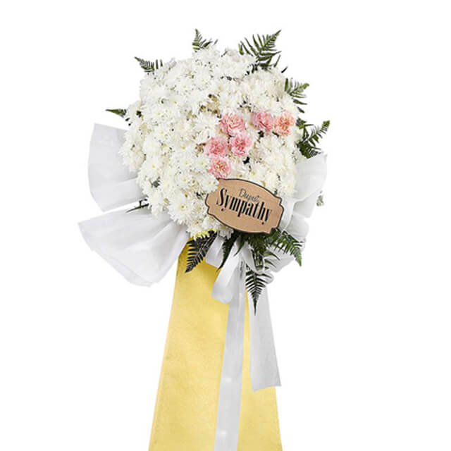 Express your condolences with this classic standing floral arrangement. Each petal and leaf carries your thoughts and heartfelt wishes, offering a tangible expression of sympathy and support.