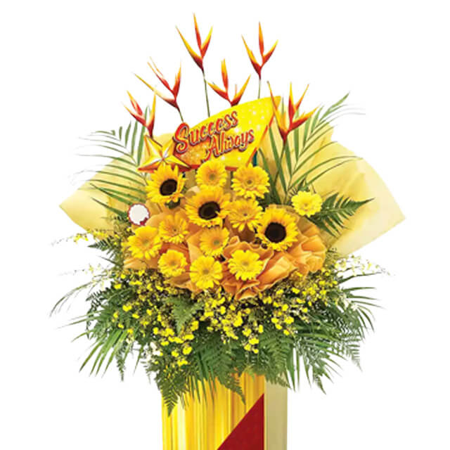 • Official Opening Standing arrangement with fresh flowers. • Official Opening Standing Consists of Sunflower (3 stalks), Light Yellow Gerbera (9 stalks), accompanied by Local Bird,Palm Leaf, Golden Shower, Johore Fern and Success Always Signage. • Height: 1.95m. • Actual colour tones of flowers may differ slightly from image.