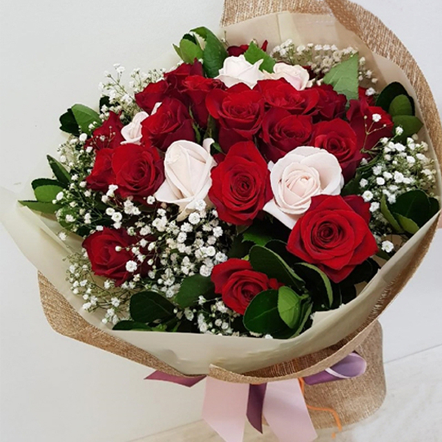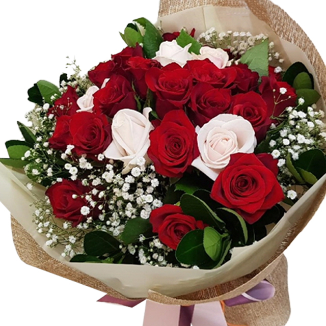 Romantic bouquet that comes with red roses, white roses, and baby breath around them. Perfect for spicing up your romance