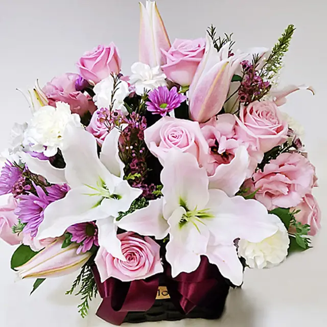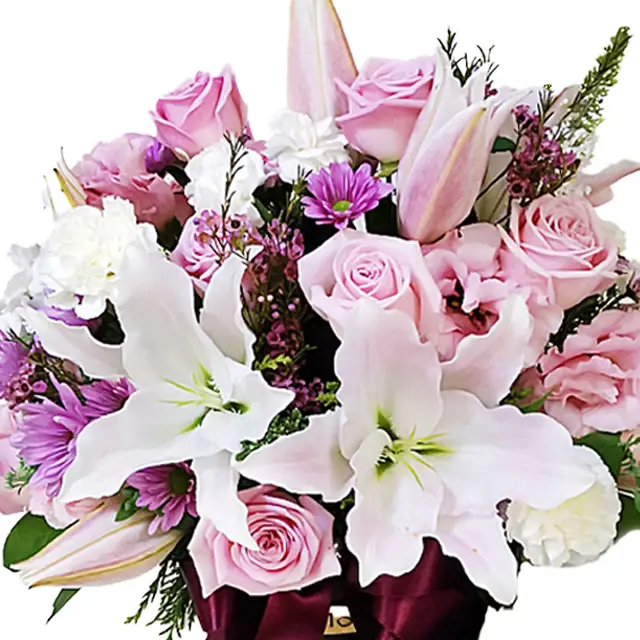 A table arrangement in a square vase consisting of white lilies, purple flowers, soft pink roses, and white carnations