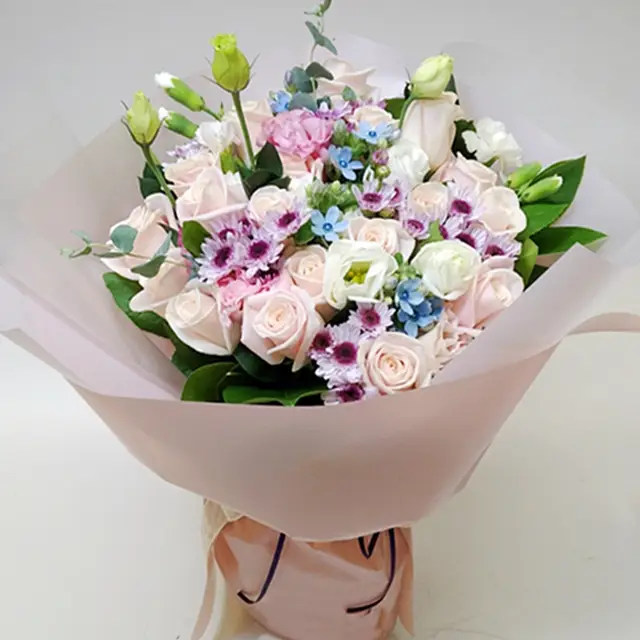 An adorable hand bouquet of soft pink roses with white roses, combined with some purple and blue flowers.