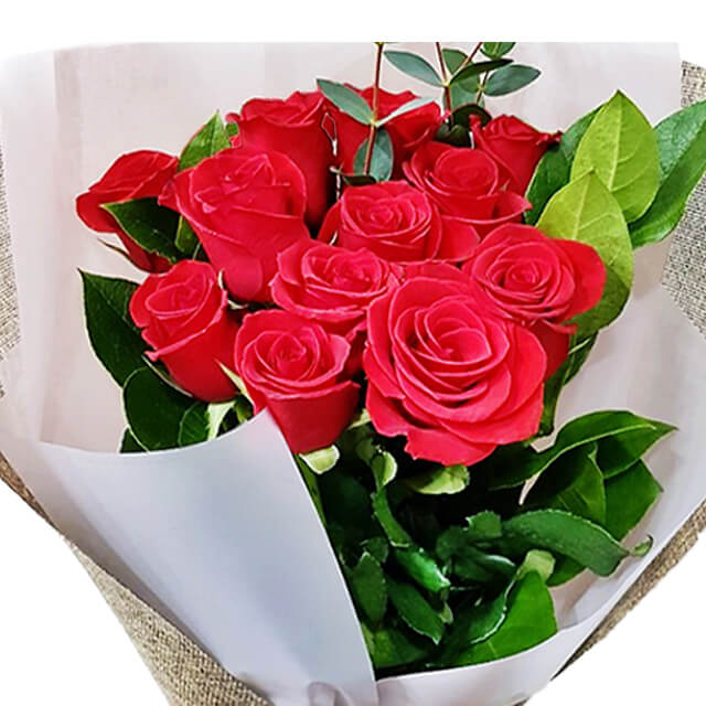 A hand bouquet of exotic red roses and green leaves. Perfect for a romantic occasion.