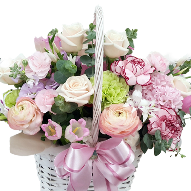 Romantic flower basket with white roses, pink roses, purple flowers, pink fillers, and greenies