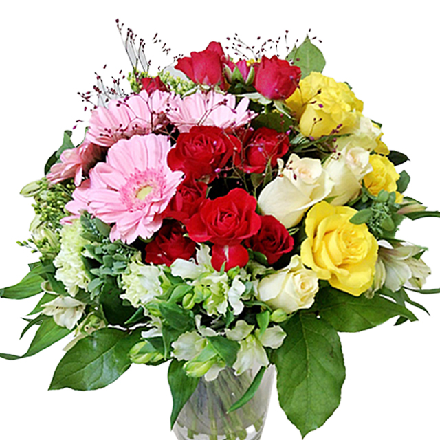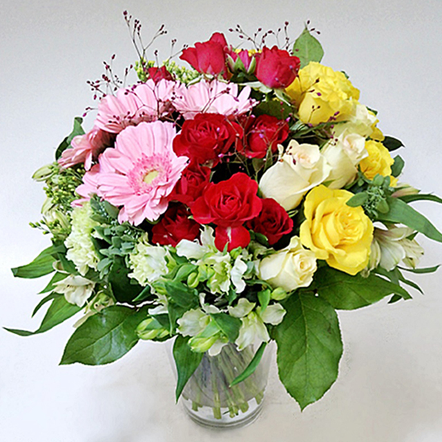 Various colored flowers mixed together in a clear vase such as yellow roses, pale yellow roses, red roses, pink gerberas, and other green fillers