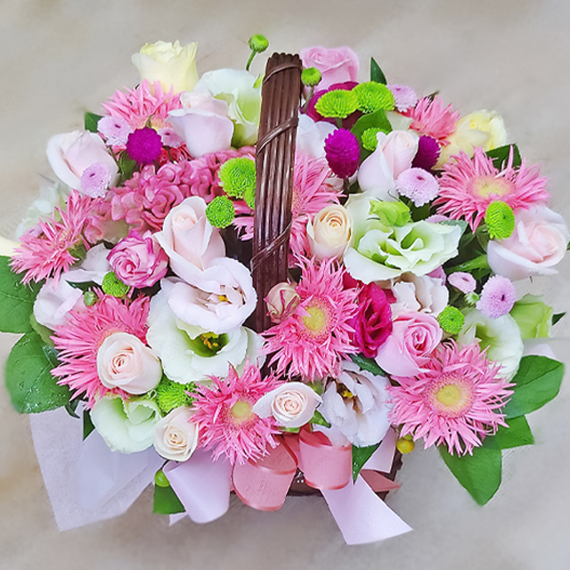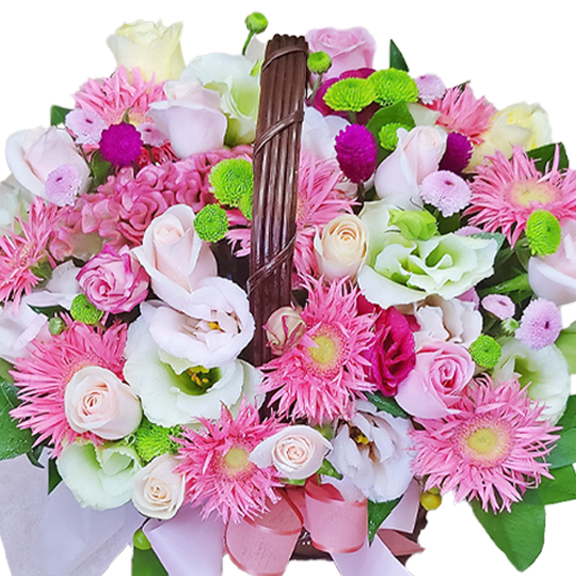 Cute basket arrangement with white roses, pink roses, pink flowers, and greenies