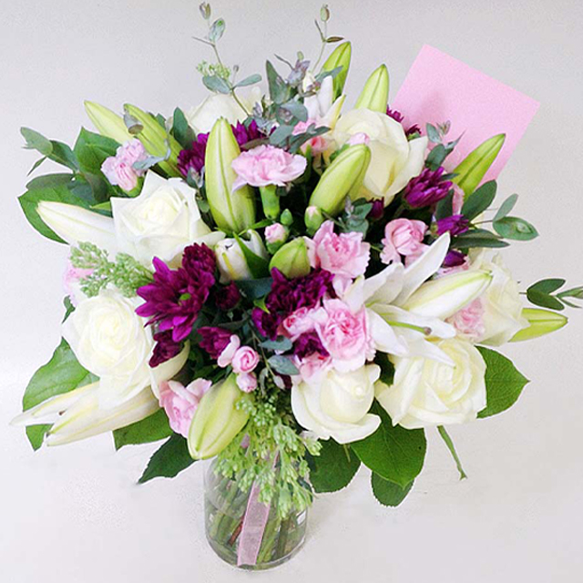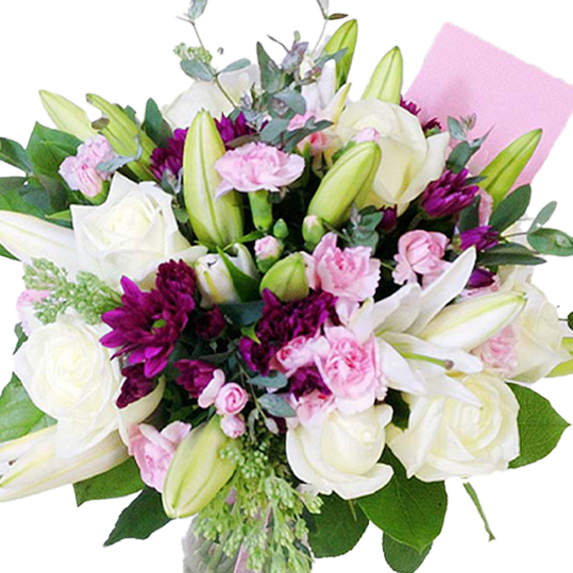 An arrangement in a clear vase consisting ofr white roses, white lilies, pink carnations, and purple flowers.