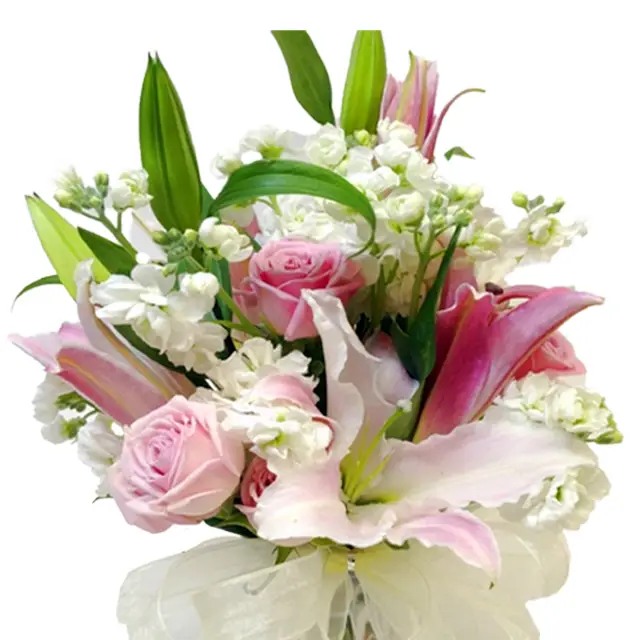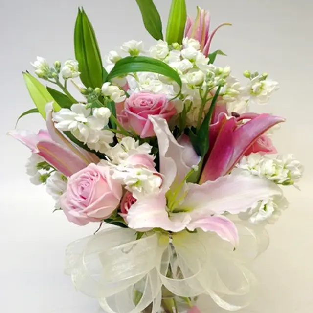 This table arrangement consists of pink lilies, pink roses, and other small white flowers