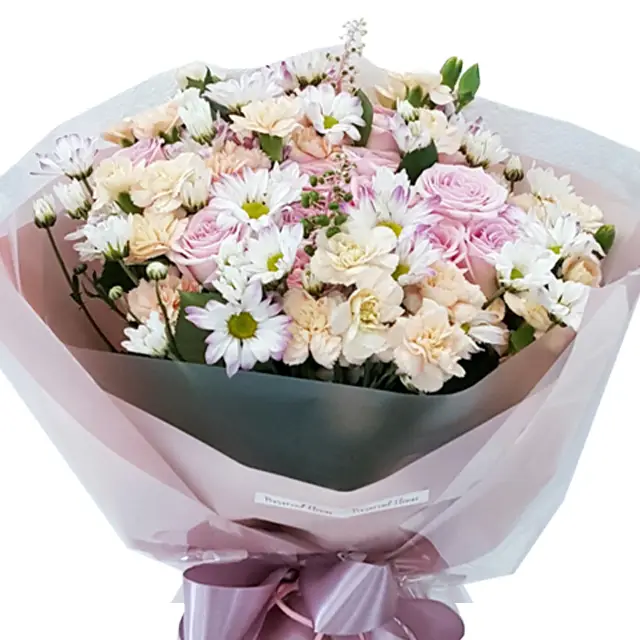 A very recommended hand bouquet to express love and gratitude. This hand bouquet consists of mostly soft pink and champagne flowers including soft pink roses.