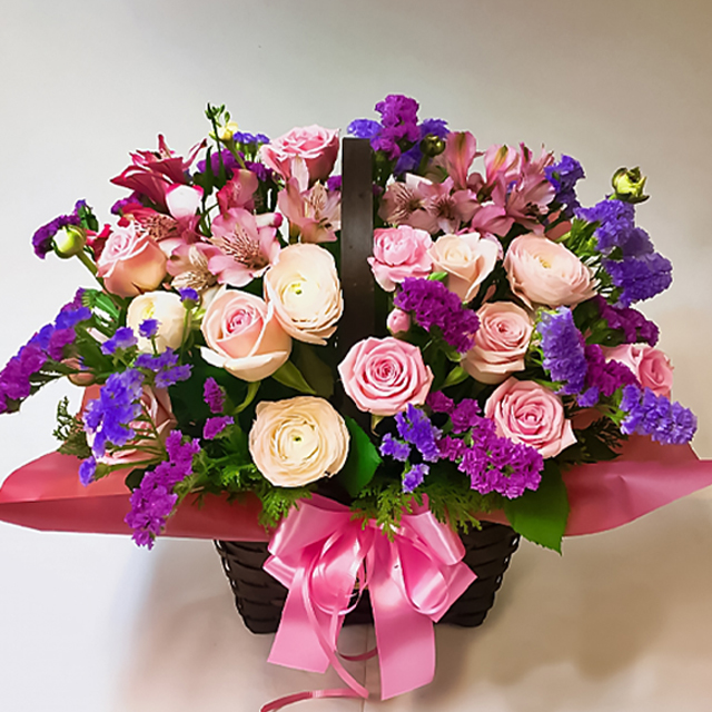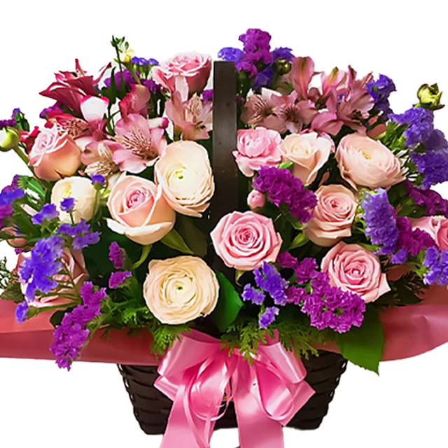 Mysteriously romantic, this arrarngement comes with pink roses, peach roses, purple fillers, and other pink flowers