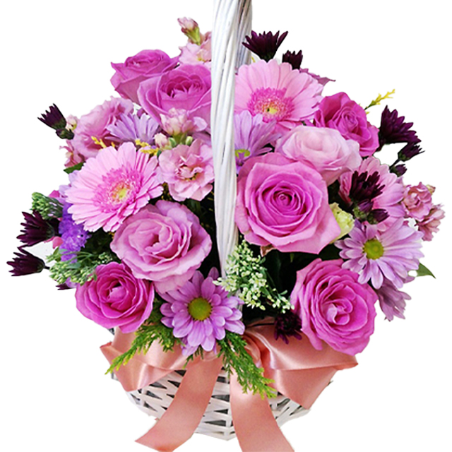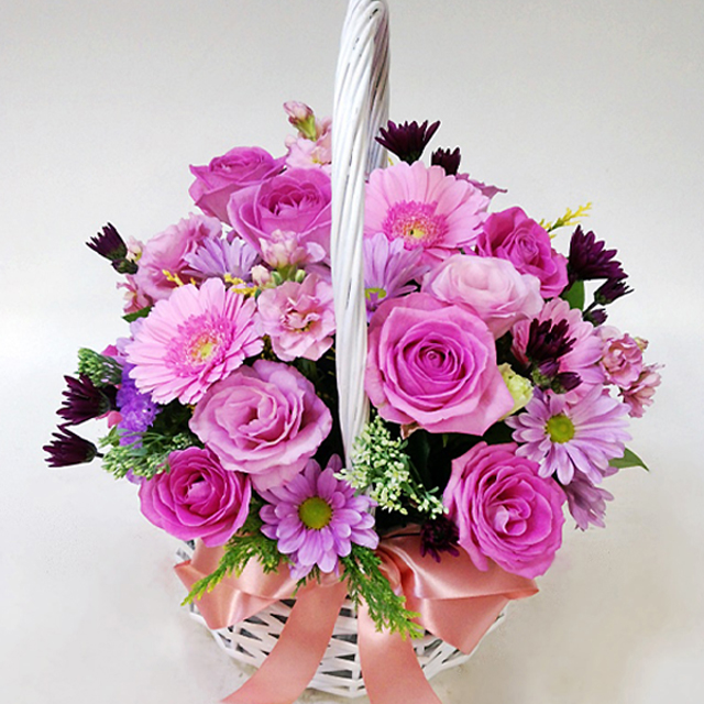 Pretty arrangement of pink roses, pink gerberas mixed with other fillers in a flower basket
