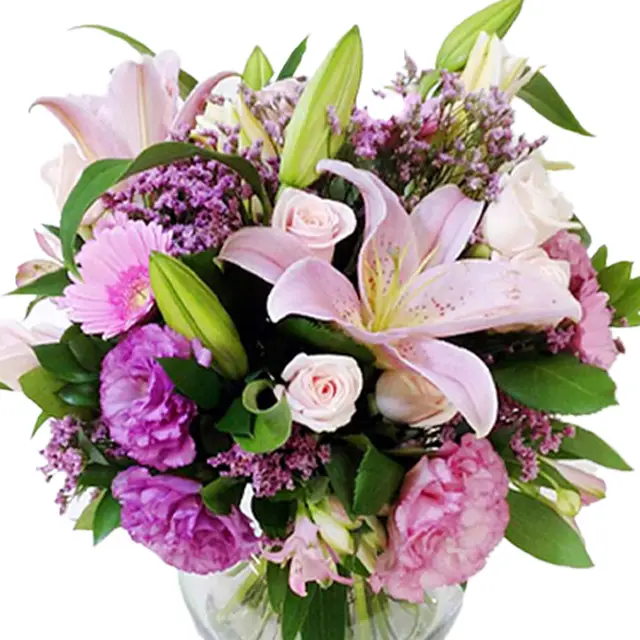 A round clear vase arrangement of soft pink roses, purple carnations, pink gerberas, lilies in bud form and bloom form
